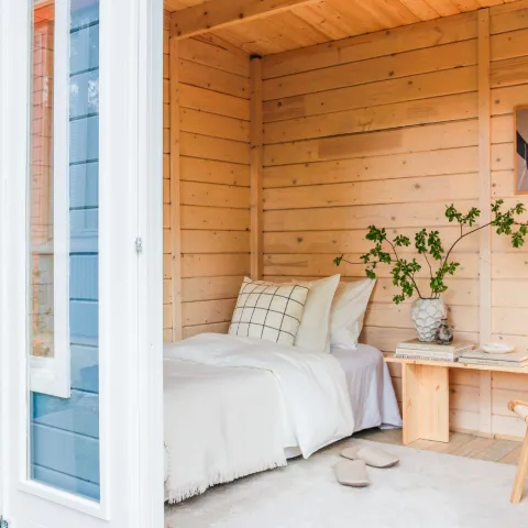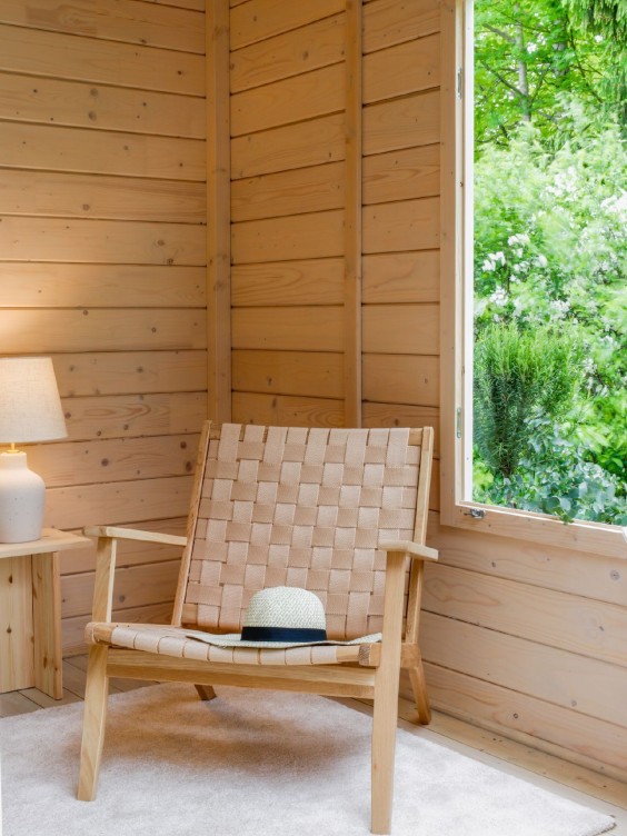 A garden log cabin is the perfect place for relaxing and rewinding while listening to birds singing and wind humming in the trees around you. Large windows ensure you’re always in touch with the surrounding nature. The cabin also serves as a comfortable extra room that can accommodate guests in the summer. Make it welcoming with cosy blankets and cushions adding to the soft overall feel.