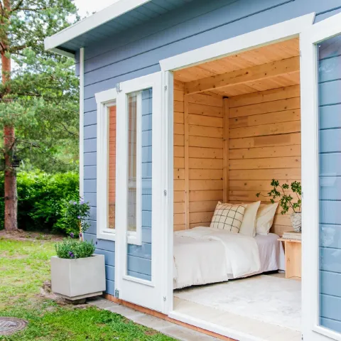 This garden log cabin was painted with Tikkurila exterior colour Q451, an easy yet lively blue with a hint of grey, on the outside with opaque wooden facade paint Vinha. White window frames in Tiira accentuate the light and serene style. The combination of these exterior colours with natural wood, subtle detailing and simple interior design creates a calming effect. Warm lighting, carefully selected houseplants, and other details complement the serenity of the colour scheme.