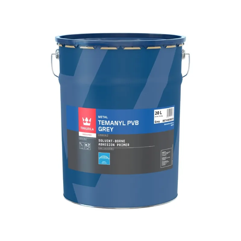 • Adheres extremely well to different kinds of surfaces, such as steel, zinc, aluminium and stainless steel. The primer ensures the durability of the whole painting system. • A very fast-drying adhesion primer, which saves time during the application process. • Withstands temperatures up to +160°C. Due to its high temperature resistance, Temanyl PVB Grey can be overcoated with powder coatings. • Can be applied using a "wet-on-wet" painting technique. • For industrial use only according to Directive 1999/13/EC.