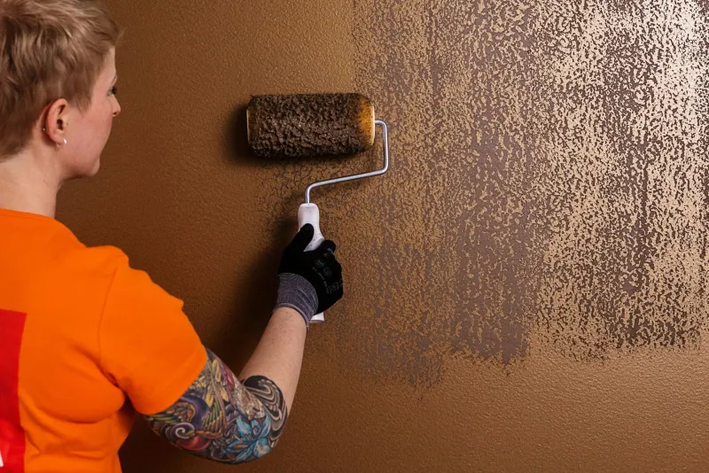 Apply Tunto Hieno N485 with a long nap paint roller using vertical strokes. Apply Tunto Hieno so lightly that some Taika paint remains visible.