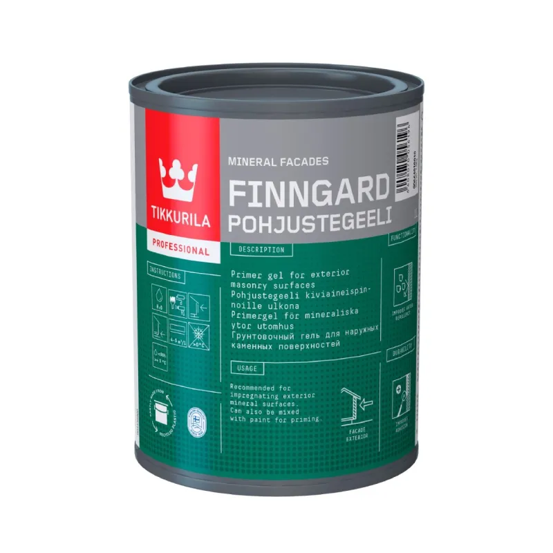 For priming exterior concrete and rendered surfaces. Mixed with paint for priming according to the paint’s product data sheet (e.g. Kivisil facade paint or Finngard Silikonihartsimaali). Can also be used for impregnating untreated concrete facade surfaces or similar vertical concrete surfaces.