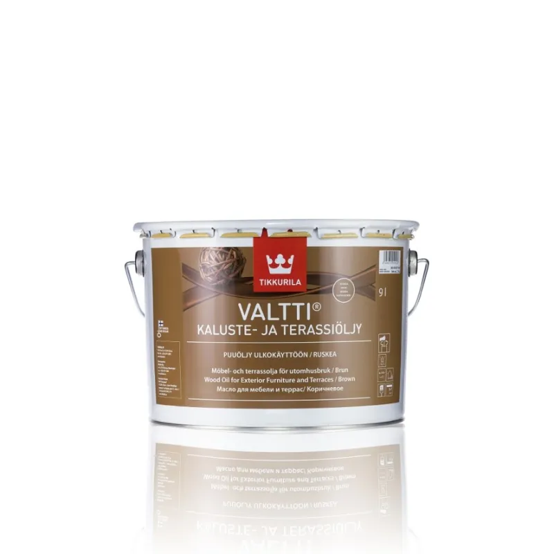 The brown color of Tikkurila’s Valtti Furniture and Decking Oil evens out the natural color of thermally modified wood, hardwood and brown impregnated wood.