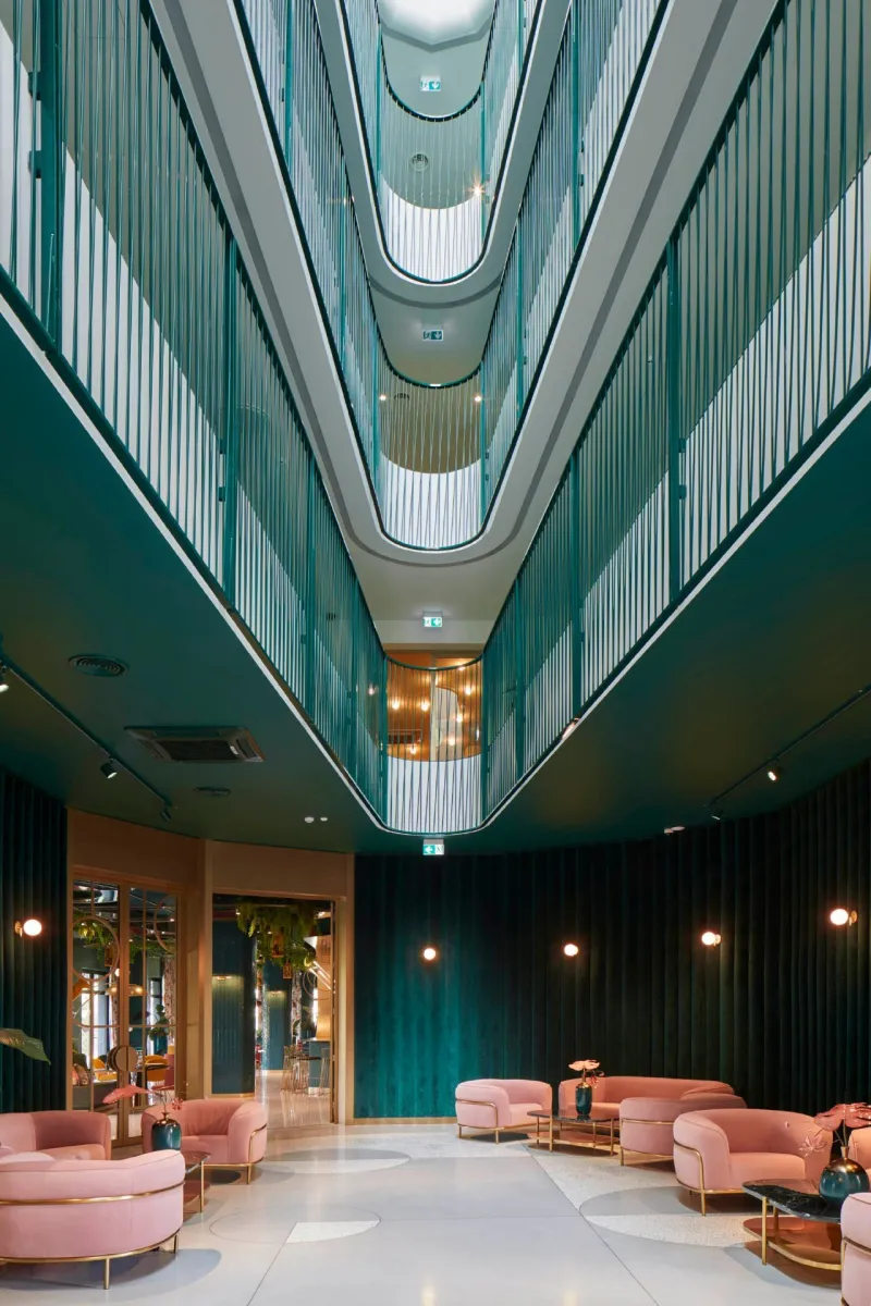 At first approach, the hotel building attracts the eye with its unusual oval shape and light façade. The decorative plaster chosen for the façade of the building and the openwork of metal cables hide the "green" idea – the façade will be planted so that greenery covers the wall. Upon entering the main lobby, guests are welcomed by incredible narrow oval-shaped openings with galleries that open out into 59 guest rooms, all with unconventional shapes and layouts. Skylights covering the whole length of the atrium offer views of blue skies above, blending with the rich colours of the interior.