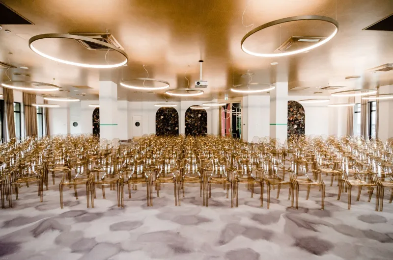 The conference hall also embodies the unique concept of Vytautas Ego SPA and looks nothing like a standard meeting room. The creative team decided to paint the acoustic ceiling panels in the conference hall gold. This unique idea was only possible because the team of architects found a suitable product: Tikkurila Taika (Gold), a water-based acrylic paint in warm, rich shades of gold. This pearlescent paint is designed for wooden, metal and concrete surfaces and can be used for painting furniture, accent walls, ornaments and other interior details. The fast-drying Tikkurila Taika creates a semi-glossy surface and gives a warmer character to modern interiors.