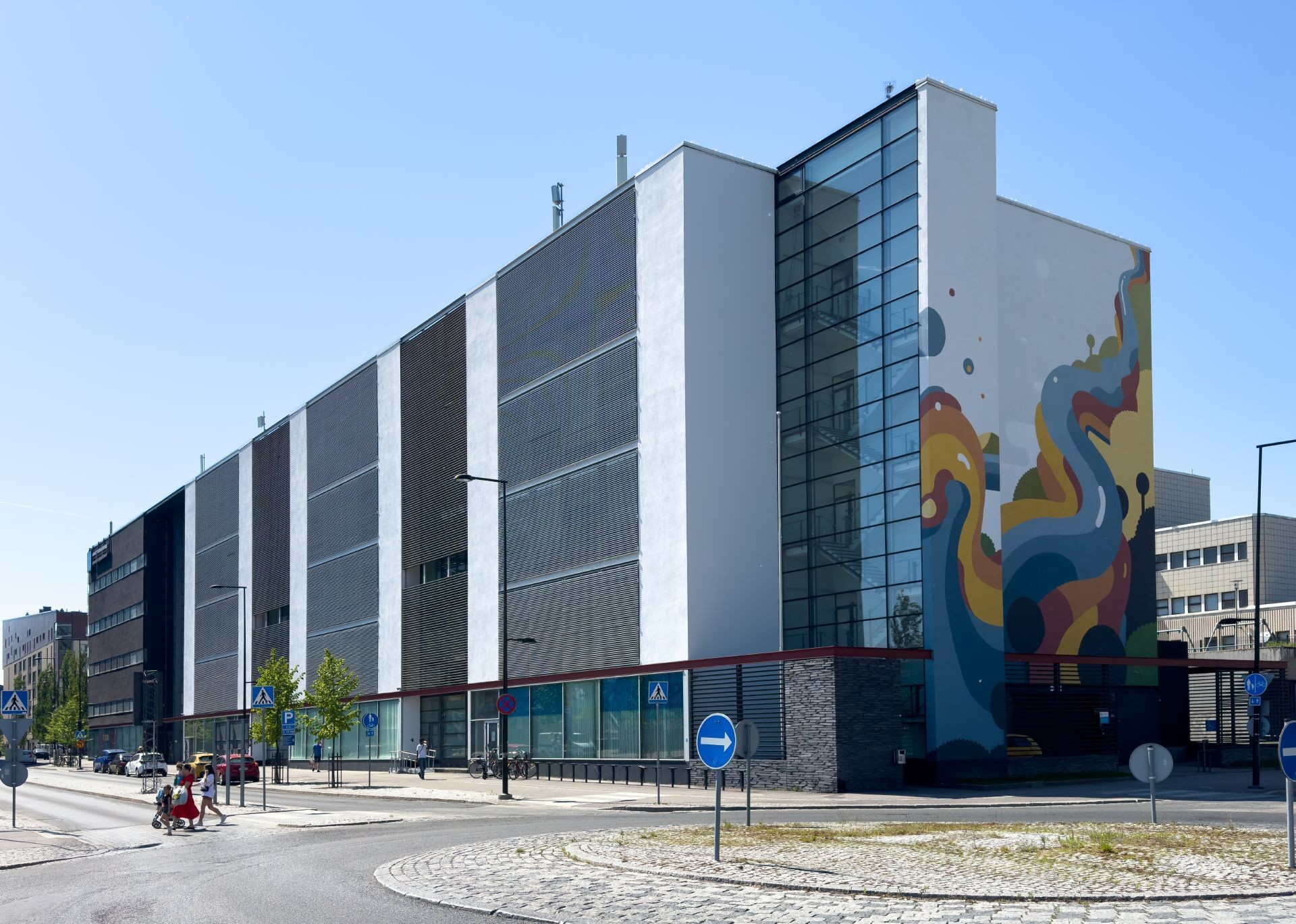 The Tikkurila campus of Laurea University of Applied Sciences is home to around 3,000 students. The building is adorned with a magnificent mural on the end wall.The mural was designed by artist Tommi Musturi in collaboration with students and staff from the university.